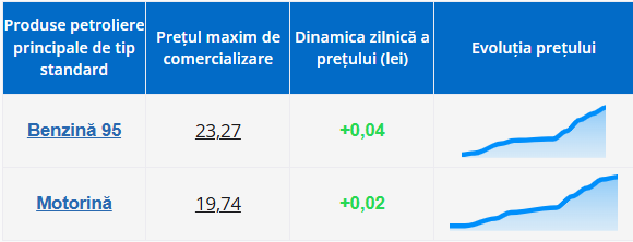 Astfel, benzina 95 nu va depăși 23,27 lei/litru, cu o creștere de 0,04 lei față de ziua precedentă, iar motorina va costa maximum 19,74 lei/litru, în urcare cu 0,02 lei.