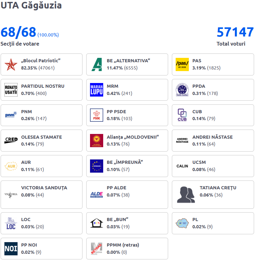 Din 57.147 de voturi în Găgăuzia, 47.061 au fost pentru Blocul Patriotic, adică 82,35%; 6.555 pentru Blocul Alternativa (11,47%), condus de Ion Ceban, Mark Tkaciuk, Ion Chicu și Alexandr Stoianoglo, ocupând astfel locul doi în clasament și 1.825 pentru PAS (3,19%), condus de Igor Grosu, care s-a poziționat pe locul trei.
