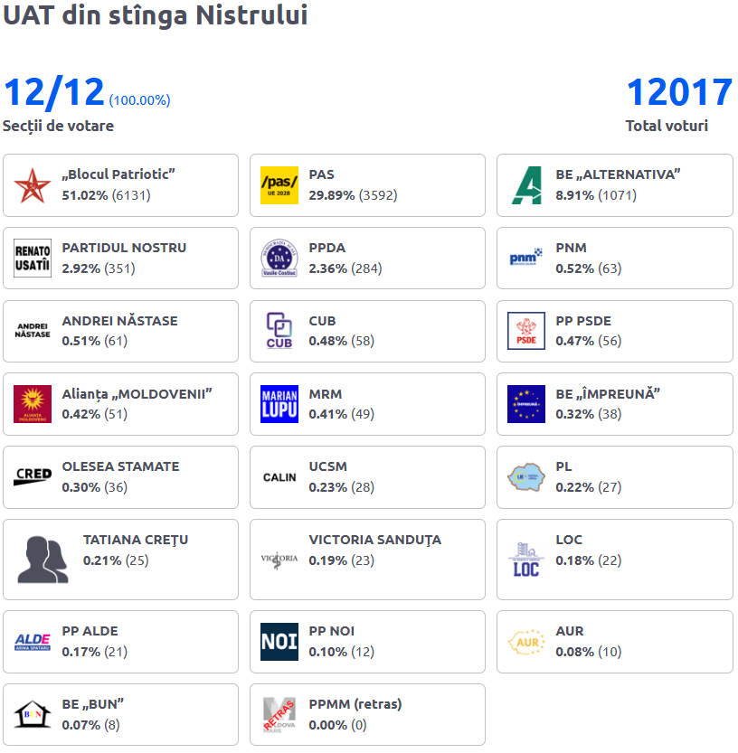 La alegerile parlamentare din 28 septembrie 2025, Blocul Patriotic, condus de Igor Dodon, Vladimir Voronin, Irina Vlah (exclusă înainte de scrutin) și Vasile Tarlev a primit cele mai multe voturi din partea alegătorilor din UTA Găgăuzia și de pe malul stâng al Nistrului.