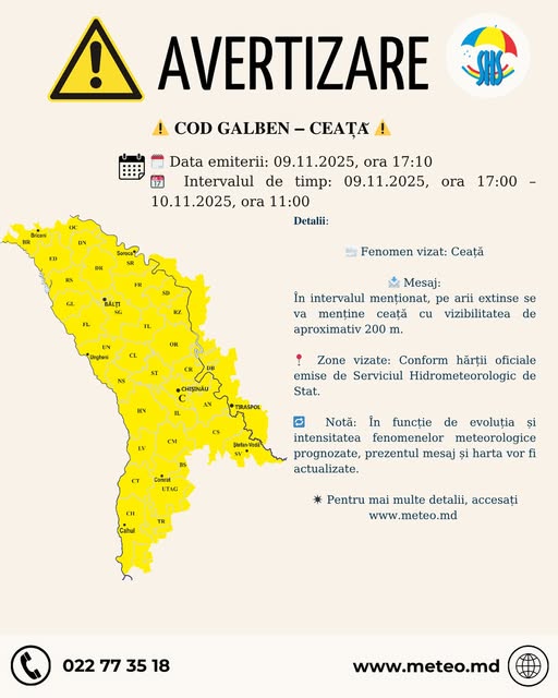 Meteorologii au emis Cod galben de ceață pentru întreaga țară. Avertizarea este valabilă din 9 noiembrie, ora 17:00, până pe 10 noiembrie, ora 11:00.