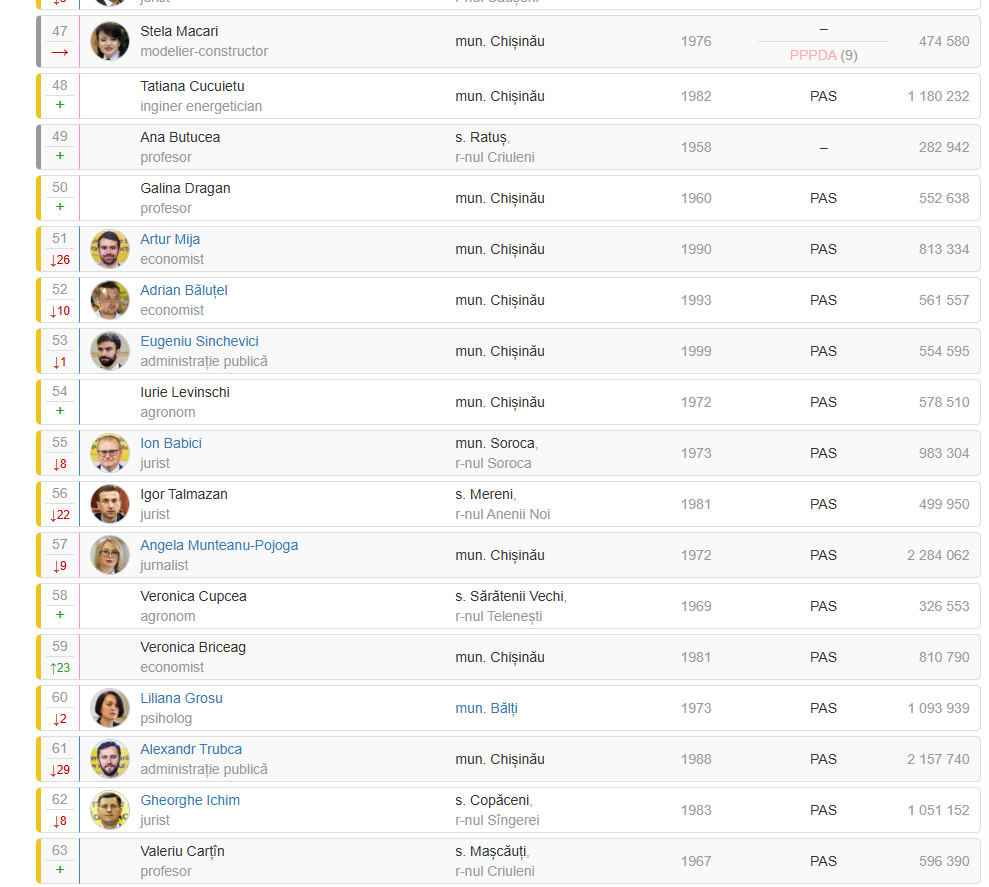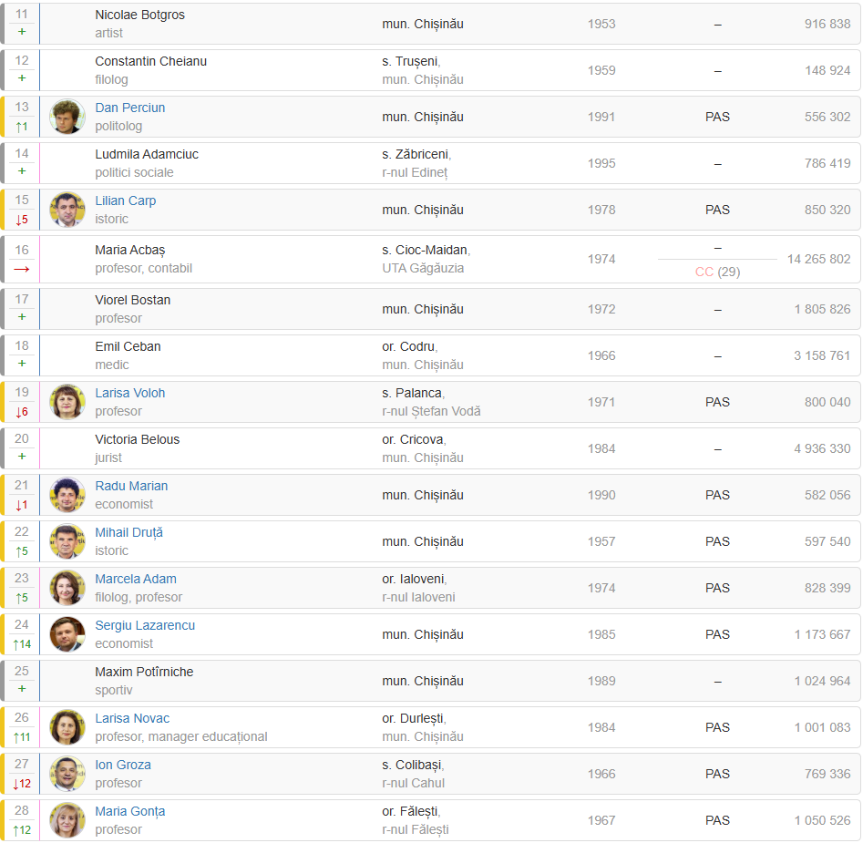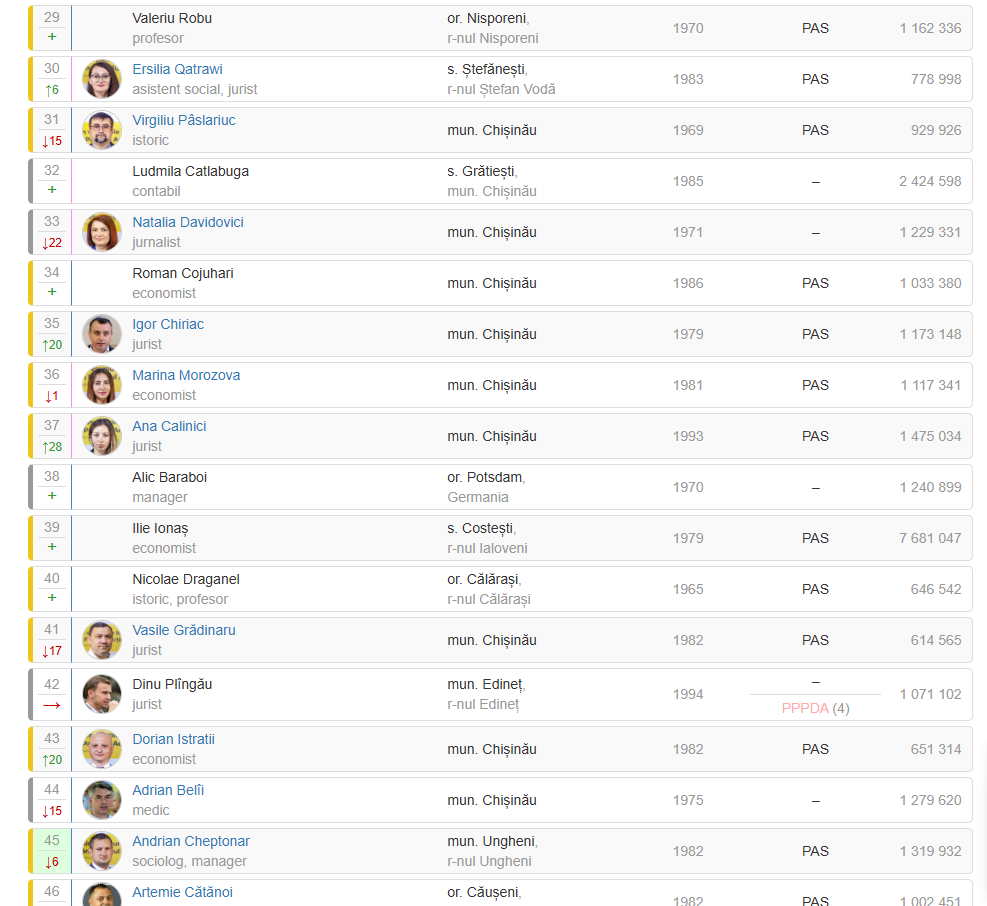 Potrivit datelor preliminare, în baza listelor depuse la Comisia Electorală Centrală, primii 10 candidați PAS care ar urma să ajungă în viitorul Legislativ sunt: