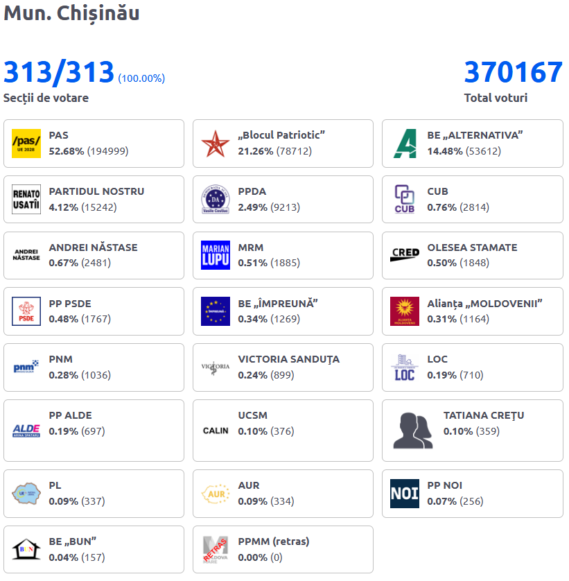 Pe 28 septembrie 2025, în Republica Moldova au avut loc alegeri parlamentare, iar în municipiul Chișinău procesul de vot s-a încheiat cu centralizarea tuturor celor 313 secții. În total, au fost exprimate 370.167 de voturi. Datele arată o victorie clară a Partidului Acțiune și Solidaritate (PAS), care a obținut mai mult de jumătate din sufragii, în capitala gestionată de Ion Ceban.