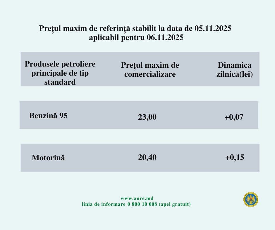 Prețul benzinei a crescut din nou și a ajuns la 23 de lei. Este noul tarif anunțat pentru ziua de joi, 6 noiembrie, de către Agenția Națională pentru Reglementări în Energetică.