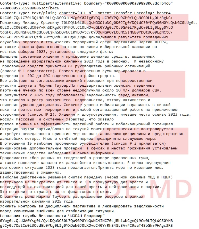 Un raport expediat pe 2 mai 2025 de Cioban către Mihail Polzikov, oficial de rang înalt din Direcția 5 a FSB, arată că Marina Tauber ar fi coordonat personal schemele de deturnare, fiind beneficiara principală a fondurilor sustrase. Documentul descrie rețele locale de lideri raionali implicați și sugerează că circa 61 de responsabili de organizații teritoriale ar fi însușit între 20% și 40% din sumele primite.