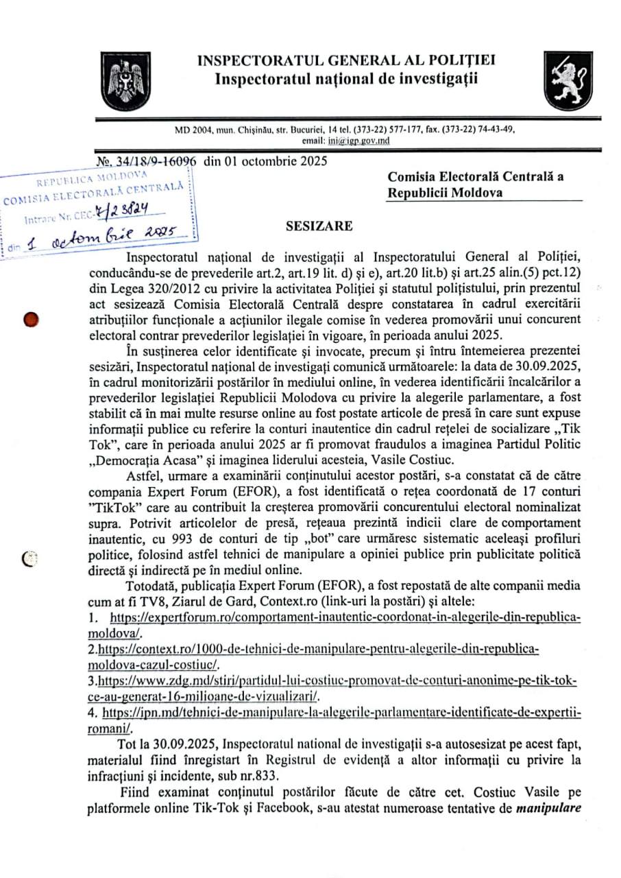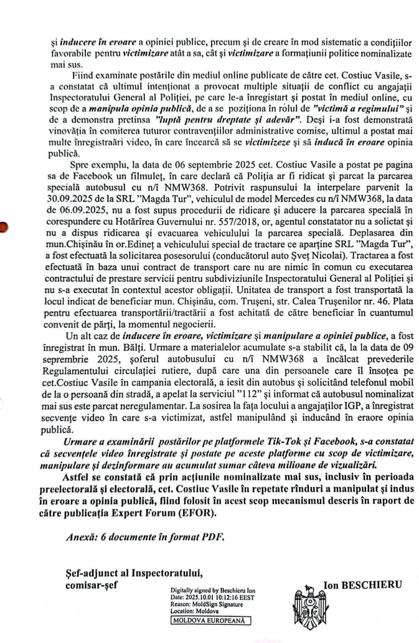 El a precizat că sesizarea citează inclusiv raportul organizației Expert Forum, care a semnalat existența unei rețele de conturi pe TikTok ce ar fi promovat intens imaginea formațiunii. Costiuc a subliniat însă că analiza respectivă a fost publicată înainte de scrutin și nu poate constitui o probă de încălcare în perioada electorală. „Dacă statul are suspiciuni privind conturi false sau promovări plătite, trebuia să solicite direct date de la TikTok. În loc de anchetă oficială, poliția face trimitere la articole de presă. Este o bătaie de joc”, a adăugat politicianul.